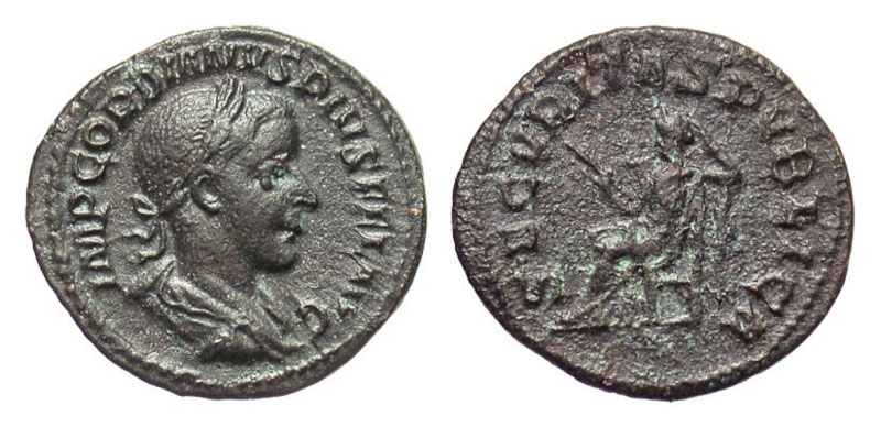 GORDIAN III, 238-244 AD. AE Limes Denarius (2.25 gm), 241. Laureate draped bust / Securitas seated holding sceptre. cf RIC.130(R). VF+, green patina. Rare. Marriage commemerative. These AE denarii are thought to be base metal coins issued to troops
