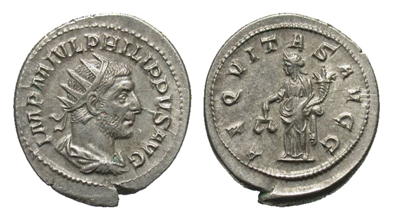 PHILIP I the ARAB,, 244-249 AD. AR Antoninianus (4.54 gm). Radiate bust / Aequitas standing holding balance. RIC.27b. Toned XF. [Est. $225.]