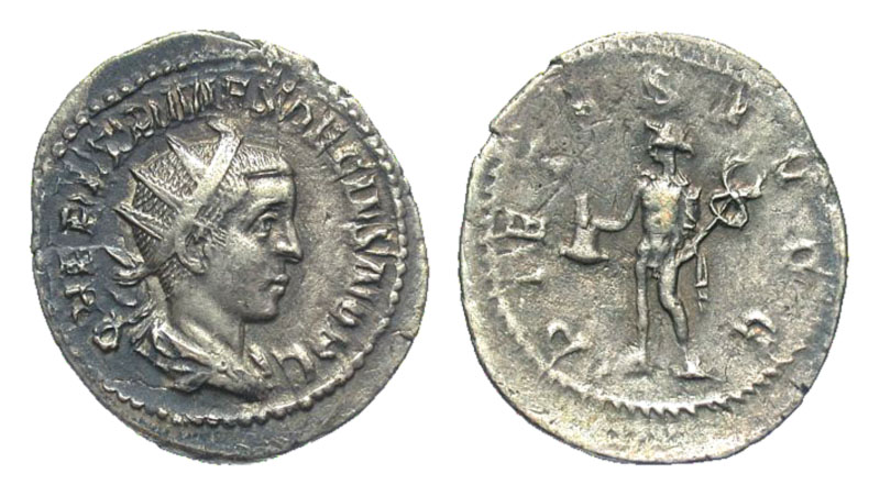 HERENNIUS ETRUSCUS, 251 AD. AR Antoninianus (3.26 gm). Radiate draped bust / Mercury standing holding purse and caduceus. RIC.142b(S). Toned aXF. Scarce. [Est. $250.]
