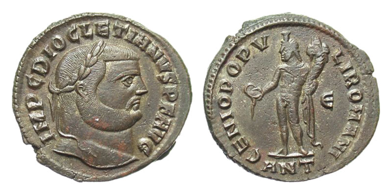 DIOCLETIAN, 285-305 AD. AE Follis (9.37 gm) of Antioch. Laureate head / Genius standing holding patera and cornucopiae. RIC.52a. XF, dark brown patina. [Est. $250.]