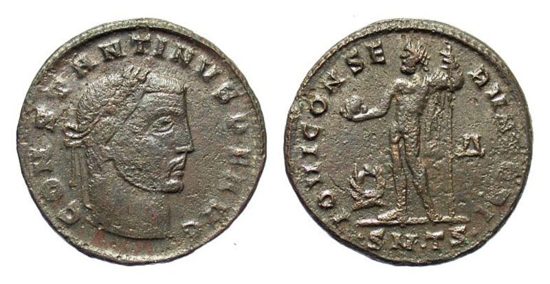 CONSTANTINE I. 306-337 AD. AE Large Module Follis (5.36 gm) of Thessalonika, 312-3 AD. Laureate head / Jupiter standing holding globe and sceptre, wreath in left field. RIC.50b. VF, brown patina, trace of silvering. [Est. $150.]