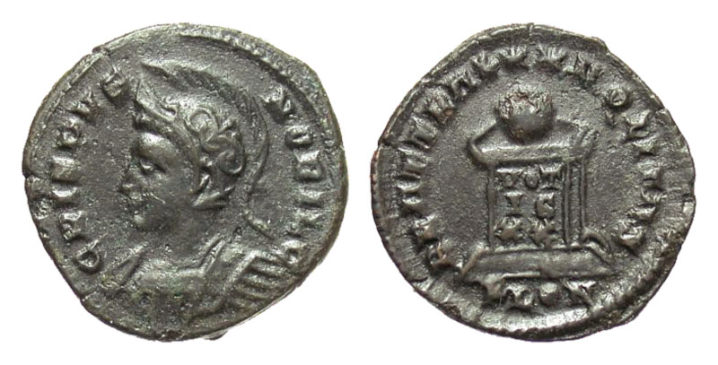 CRISPUS, d. 326 AD. AE Follis (3.32 gm) of London 323-4. Helmeted cuirassed bust / Altar with votive inscription. RIC.275. Near Mint, brown patina. [Est. $150.]