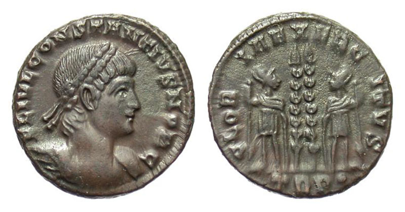 CONSTANTIUS II, 337-361 AD. AE Follis (2.55 gm) of Trier, as Caesar, 330-334. Laureate draped bust / Two soldiers standing with two standards. RIC.528. XF, dark brown patina. [Est. $125.]