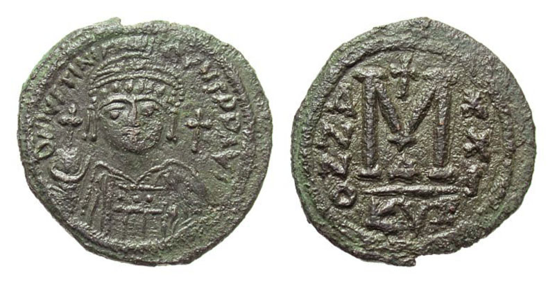 BYZANTINE EMPIRE. Justinian I, 527-565 AD. AE Large Module Follis (19.40 gm) of Kyzicus, yr 21, A. Crowned bust facing / Large M. S.207. VF+, dark green patina. [Est. $300.]