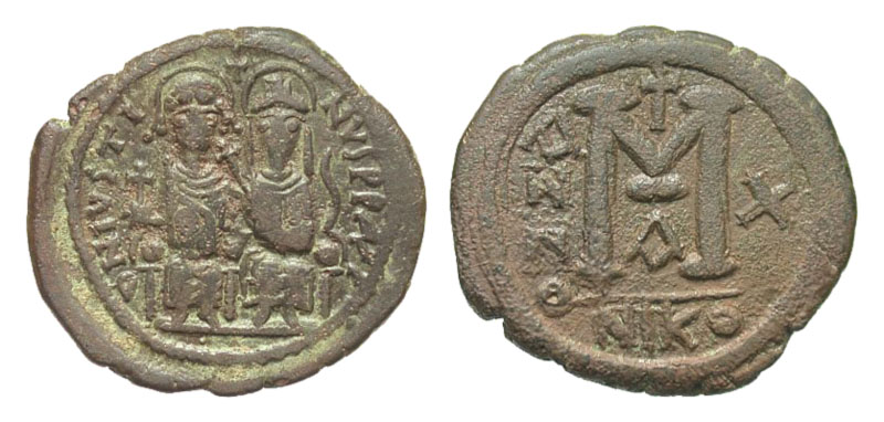 BYZANTINE EMPIRE. Justin II, 565-578 AD. AE Follis (11.49 gm) of Nikomedia, yr. 10, A. Justin and Sophia enthroned / Large M. S.369. VF, olive brown patina. [Est. $150.]