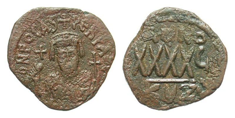 BYZANTINE EMPIRE. Phocas, 602-610 AD. AE Follis (12.36 gm) of Kyzikos, yr. 7 A. Crowned bust facing / Large XXXX. S.665. aVF, brown patina. [Est. $150.]