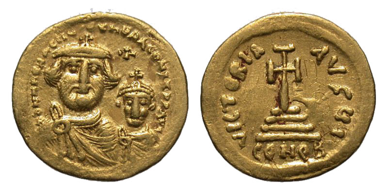 BYZANTINE EMPIRE. Heraclius, 610-641 AD. Gold Solidus (4.44 gm) of Constantinople. Crowned busts of emperor & son / Cross on steps. S.734. VF. [Est. $650.]