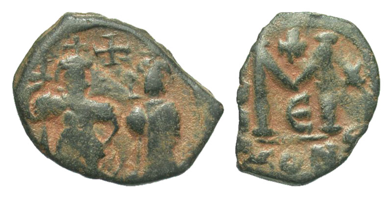 BYZANTINE EMPIRE. Heraclius, 610-641 AD. AE Follis (4.72 gm) of Constantinople, yr. 26, E. Heraclius and Heraclius Constantine standing / Large M, cross above. S.810. Fine+, earthy black patina. Rare. [Est. $100.]