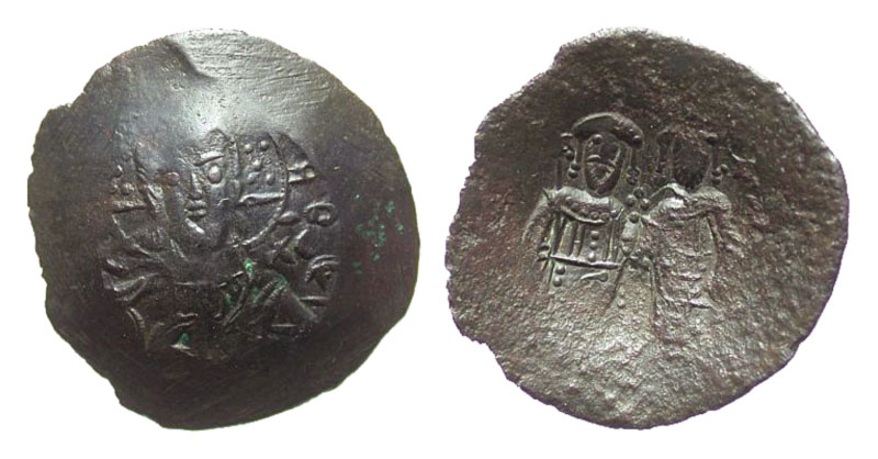 BYZANTINE EMPIRE. Alexius III, 1195-1203 AD. Billon Aspron Trachy (2.35 gm). Bust of Christ facing / Emperor and St. Constantine standing. S.2012. VF, brown patina, [Est. $80.]