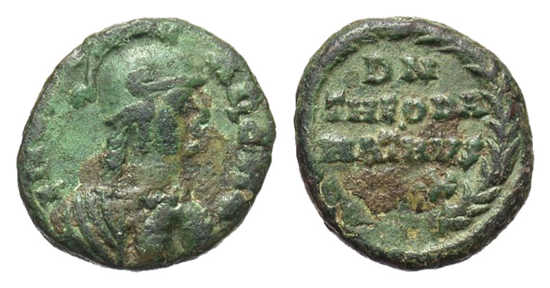 OSTROGOTHS. Theodahad, 534-536 AD. AE Dekanummium (4.01gm). Helmeted bust of Roma / DN THEODA HATHVS REX in wreath. MEC.144. Th.1007. aVF, green patina. [Est. $400.]