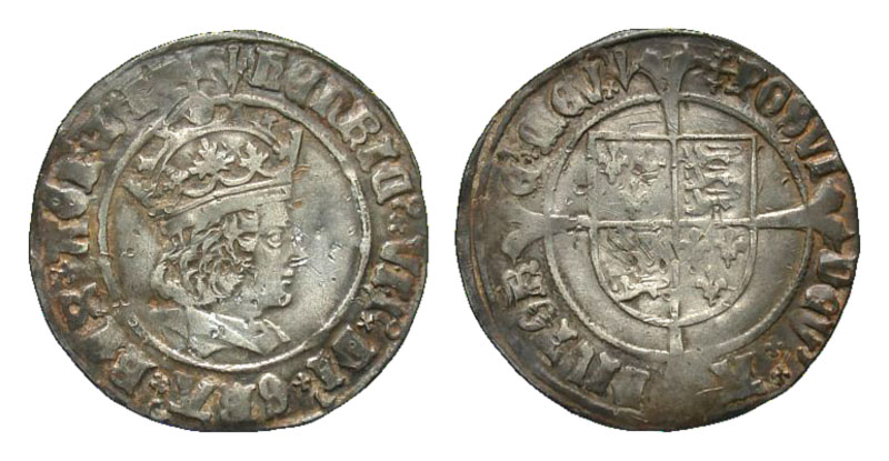 ENGLAND. Henry VII, 1485-1509 AD. AR Groat (3.05 gm), i. m. phoen. Crowned bust in profile / Shield of arms on long cross. S.2258. Toned VF, few old dings. [Est. $650.]