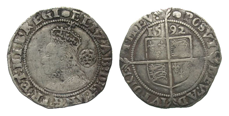 ENGLAND. Elizabeth I , 1558-1603 AD. AR Sixpence (3.01 gm), fifth issue, i. m. Tun, 1592 AD. Crowned draped bust / Shield of arms on long cross. S.2578A. Toned Fine+. [Est. $200.]