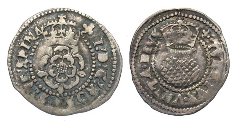 ENGLAND. James I, 1603-1625 AD. AR Halfgroat (0.91 gm), 2nd coinage, i. m. Trefoil, 1613. Crowned rose / Crowned thistle. S.2660. Toned VF. [Est. $125.]