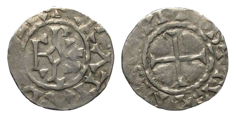 CAROLINGIANS. Charles II the Bald, 840-877 AD. AR Denier (1.09 gm), Tours. KAROLVS monogram / Cross. MEC.903v. Toned aVF, clipped. Possibly a later posthumous striking under Charles the Simple. [Est. $300.]