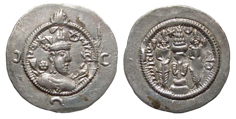Lot 30-064. Sasanian Kingdom. Khusru I. A.D. 531-579. AR drachm. HWC (Gunde-Shapur) mint, year 25. Rare.