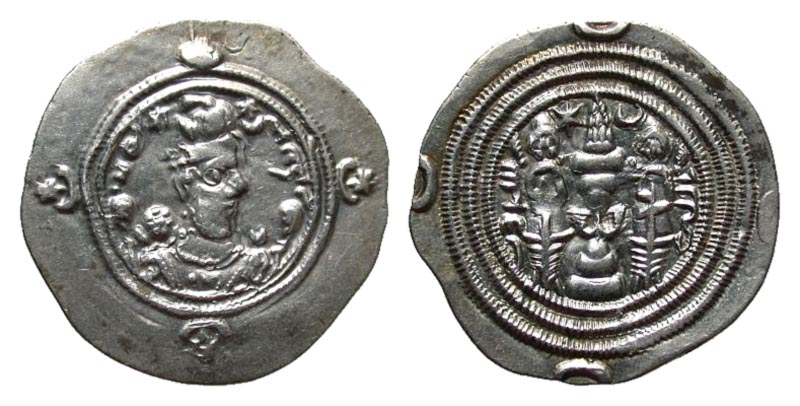 Lot 30-065. Sasanian Kingdom. Khusru II. A.D. 591-628. AR drachm. WYHC (Veh Az Amid Kavad), year 1. Rare first year issue.