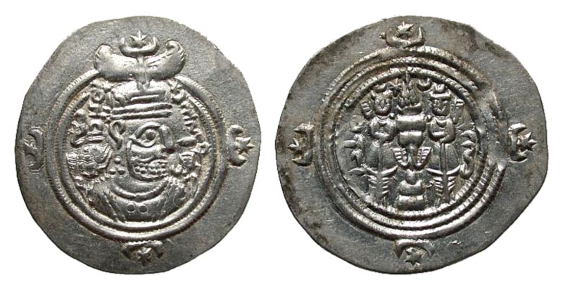 Sasanian Kingdom. Hormizd V. A.D. 631-632. AR drachm (30.8 mm, 3.51 g, 3 h). WYHC (Veh Az Amid Kavad), year 2. Crowned and cuirassed bust right, two stars above crest, three stars within crescents around / Fire altar with attendants and ribbon, star and crescent flanking flames, four crescents and stars around triple border of dots. G�bl 230. choice EF.