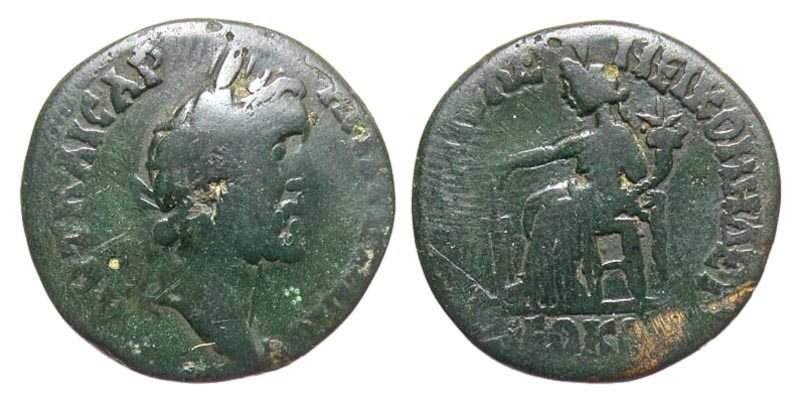 Bithynia, Nicomedia. Antoninus Pius. A.D. 138-161. Æ diassarion (22.1 mm, 5.80 g, 7 h). AVT KAICAP ANTΩNEINOC, laureate head right / MHTPOΠOΛE NEIKOMHΔEI NEΩKOP, Tyche seated left, wearing kalathos, holding rudder and cornucopia. Rec Gen 62; SNG Cop 555; RPC online 5595 temp. Fine, glossy black patina.