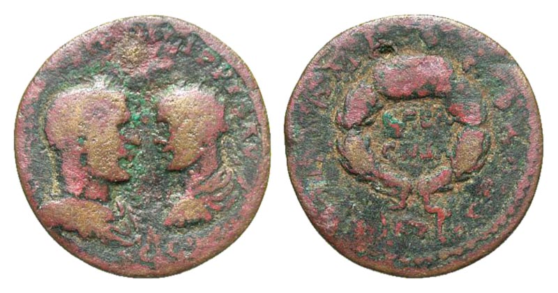 Syria, Coele-Syria. Damascus. Philip I. A.D. 244-249. Æ 30 (29.5 mm, 16.09 g, 1 h). Olympia Sebasmia Games issue. Very Rare. IMP PO DN IMP PHILIPPVS AVG, laureate, draped, and cuirassed bust of Philip I right vis-à-vis radiate, draped, and cuirassed bust of Philip II left / COM DAMAS METROPO, CЄBA/CMIA in two lines within wreath with large central jewel inscribed IЄPA; below, head of ram right. Unpublished in standard references; cf. Klose & Stumpf 269 (Trebonianus Gallus); cf. 1030 88, Lot 1036; DNW A6, 5726. a Fine.