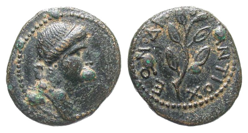 Syria, Seleucis and Pieria. Antiochia ad Orontem. Civic Issue. Time of Nero. AE dichalkon (18.2 mm, 4.21 g, 12 h). Dated 104 = A.D. 55/56. Draped bust of Apollo, wearing tainia / ANTIOXEΩN ΔP, laurel branch. McAlee 104; RPC 4289; BMC 71. VF.