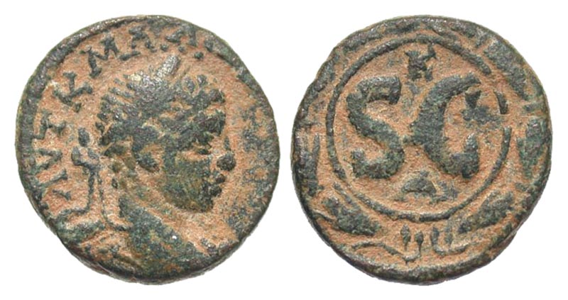 Syria, Seleucis and Pieria. Antiochia ad Orontem. Elagabalus. A.D. 218-222. Æ as (16.4 mm, 4.18 g, 12 h). Rare. AVT K M A ANTΩNЄINOC, laureate bust right, slight drapery on far shoulder / S·C within wreath, K above, A below. McAlee 796; BMC 444. VF, sandy red patina.