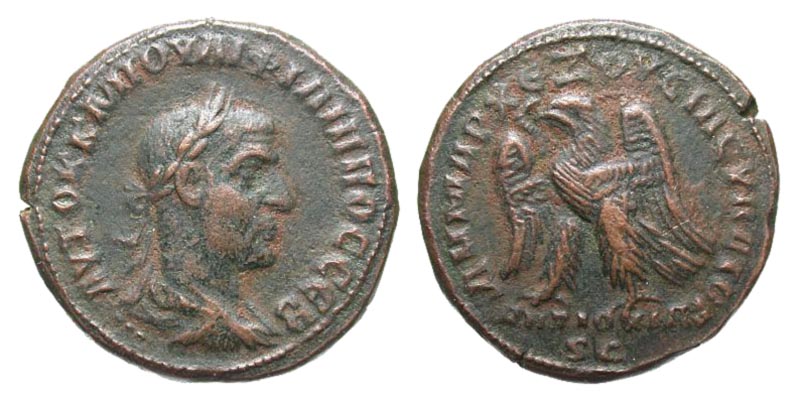 Syria, Seleucis and Pieria. Antiochia ad Orontem. Philip I. A.D. 244-249. BI tetradrachm (26.5 mm, 11.23 g, 1 h). Dated A.D. 247. AVTOK K M IOVΛI ΦIΛIΠΠOC CEB, radiate, draped, and cuirassed bust right / ΔHMAPX EΞOVCIAC VΠATO Γ, ANTIOXIA SC, eagle standing, head right, holding wreath in beak, with wings spread. Prieur 377; McAlee 904. VF, dark toning.