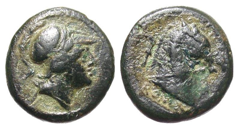 Anonymous [Sickle]. Ca. 241-235 B.C. Æ litra (15.1 mm, 2.76 g, 6 h). Rome mint. Helmeted head of Mars right / ROMA, Horsehead right; sickle behind. Crawford 25/3; Sydenham 26. aVF, black patina with yellow-green highlights.