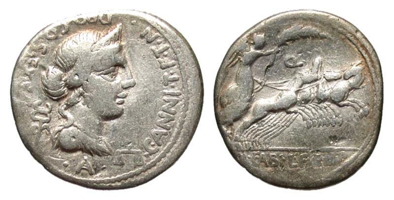 C. Annius T.f. T.n and L. Fabius L.f. Hispaniensis. 82-81 B.C. AR denarius (20.3 mm, 3.79 g, 9 h). Mint in northern Italy or Spain. C·ANNI·T·F·T·N·PRO·COS·EX·S·C, draped bust of Anna Perenna right, wearing stephane; winged caduceus to left, scales to right, carnyx below neck / L·FABI·L·F·HISP, Victory driving quadriga right, holding palm and reins; Q above horses. Crawford 366/1a; Sydenham 748; RSC Antonia 2a. aVF.
