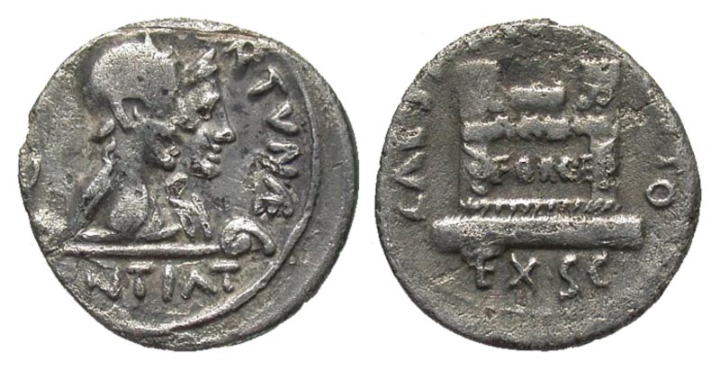 Augustus. 27 B.C.-A.D. 14 AR denarius (18.3 mm, 3.31 g, 2 h). Rome mint, Struck 19-18 B.C. Q. Rustius, moneyer. Q RVSTIVS FORTVNÆ, ANTIAT, jugate, draped busts right of Fortuna Victrix, wearing round helmet, and Fortuna Felix, diademed, set on bar with ram's heads / CAESARI AV GVSTO, EX - S - C, ornamented altar inscribed FOR RE. RIC 322; RSC 513; BMC 2. aVF.