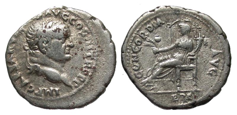 Vespasian. A.D. 69-79. AR denarius (18.5 mm, 3.34 g, 5 h). Ephesus mint, Struck A.D. 71. IMP CAESAR VESPASIANVS AVG COS III TR P P P, laureate head right / CONCORDIA AVG, Ceres seated left, holding corn ears, poppies and cornucopia, EPHE monogram in exergue. RIC 1428; RPC 830; RSC 67. VF, minor pitting.