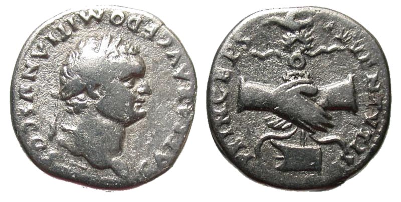 Domitian. As Caesar, A.D. 69-81. AR denarius (17.8 mm, 3.15 g, 5 h). Rome mint, Struck A.D. 79. CAESAR AVG F DOMITIANVS COS VI, laureate head right / PRINCEPS IVVENTVTIS, clasped hands holding legionary eagle set on prow. RIC 1081 (Vespasian); BMCRE 269 (Vespasian); RSC 393. Fine.