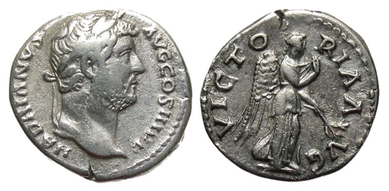 Hadrian. A.D. 117-138. AR denarius (17.4 mm, 2.63 g, 6 h). Rome mint, Struck A.D. 134-338. HadrianVS AVG COS III P P, laureate head right / VICTORIA AVG, Victory (Nemesis) advancing right, drawing drapery with her right hand and holding branch downward with her left. RIC 282; BMCRE 761; RSC 1455. VF.