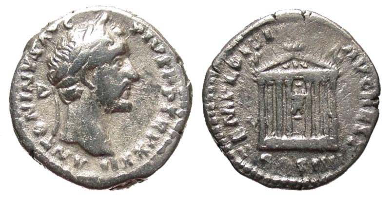 Antoninus Pius. A.D. 138-161. AR denarius (17.7 mm, 3.47 g, 7 h). Rome mint, Struck A.D. 158-159. ANTONINVS AVG PIVS PP, laureate head right / TEMPL DIVI AVG REST, COS IIII, seated figures of Divus Augustus and Livia, set on podium, within octastyle temple. RIC 143; BMCRE 549; RSC 799b. aVF.