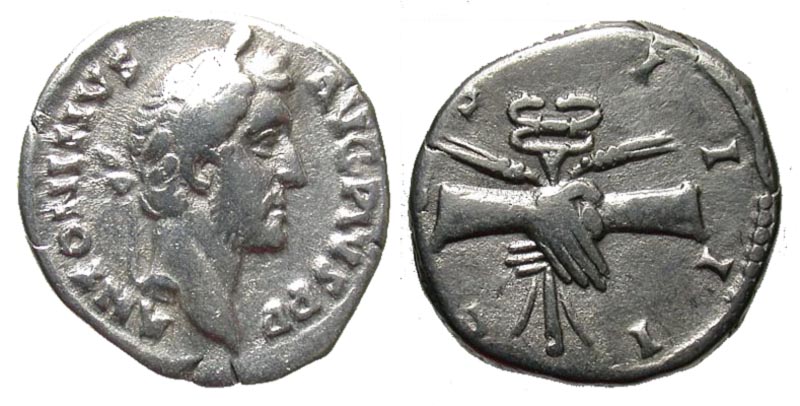 Antoninus Pius. A.D. 138-161. AR denarius (18.2 mm, 3.06 g, 5 h). Rome mint, Struck A.D. 146. ANTONINVS AVG PIVS PP, laureate head right / COS IIII, clasped hands holding caduceus and grain-ears. RIC 136; BMCRE 536; RSC 344. VF.