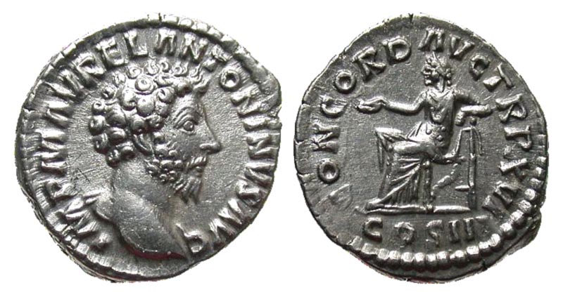 Marcus Aurelius. A.D. 161-180. AR denarius (18.4 mm, 3.29 g, 5 h). Rome mint, Struck A.D. 161-162. IMP M AVREL ANTONINVS AVG, laureate head right / CONCORD AVG TR P XVI, COS III, Concordia seated left, holding patera; cornucopia under seat. RIC 33; BMCRE 194; RSC 33. EF.