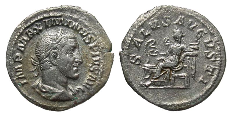 Maximinus I 'Thrax'. A.D. 235-238. AR denarius (20.3 mm, 2.54 g, 1 h). Rome mint, Struck A.D. 236. IMP MAXIMINVS PIVS AVG, laureate, draped and cuirassed bust right / SALVS AVGVSTI, Salus seated left, feeding snake rising from altar. RIC 14; BMCRE 99; RSC 85a. VF.