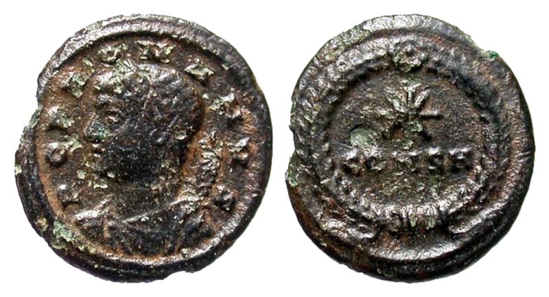 Constantine I. A.D. 307/10-337. Æ 4 (14.4 mm, 0.99 g, 11 h). Constantinople mint, Struck ca. A.D. 330. Rare. POP ROMANVS, draped bust of Genius Romanii facing left, cornucopia over shoulder / Wreath around, star over CONSH. RIC 22; LRBC 1067. aVF.