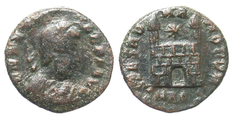 Flavius Victor. A.D. 387-388. Æ 4 (13.0 mm, 1.24 g, 5 h). Aquileia mint, Struck A.D. 387-388. D N FL VICTOR P F AVG, diademed, draped and cuirassed bust right / SPES ROMANORVM, camp gate with two turrets and one star above; SMAQS in exe. RIC 55b; LRBC 1004. Fine.