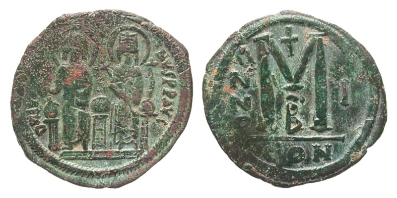 Justin II. 565-578. Æ Follis (32.9 mm, 15.89 g, 7 h). Constantinople mint, Year 1 = 565/566. D N IVSTINVS PP AV, Justin II and Sophia seated on throne facing, both nimbate; he holds a globus cruciger while she holds a cruciform scepter / Large M, ANNO to left, cross above, B below, I to right, CON in exe. SBV 360; DOC22b. VF, green patina.