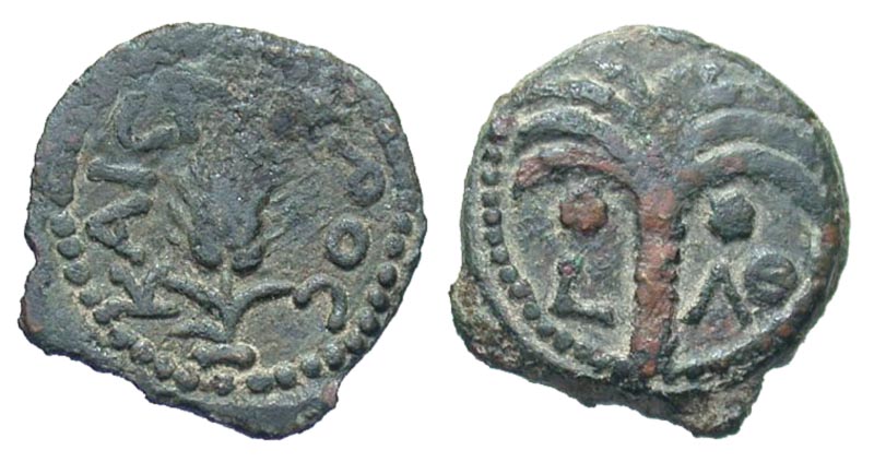 Lot 31-066. Marcus Ambibulus. 9-12 C.E. Æ prutah. Prefect under Augustus, Dated year 39 = 8/9 C.E..