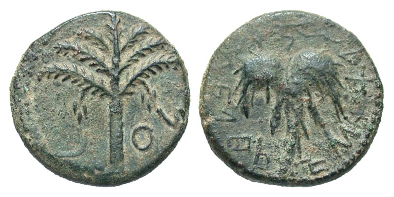 Bar Kochba Revolt. 132-135 C.E. Æ middle bronze (24.0 mm, 9.97 g, 7 h). Undated issue (year 2 = 133/4 C.E.). Palm tree with two bunches of dates / Grape leaf on vine. Hendin 1408; Meshorer TJC 260a. gVF, sandy patina.
