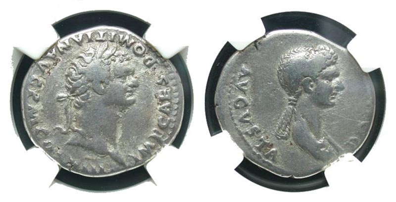 Roman Provincial. Domitian. A.D. 81-96. AR cistophorus (10.56 g). Ephesus mint, Struck ca. A.D. 82. IMP CAES DOMITIAN AVG P M COS VIII, laureate head right / DOMITIA AVGVSTA, draped bust of Domitia right. RPC 866; RIC 228; RSC 2. VF, graffito.