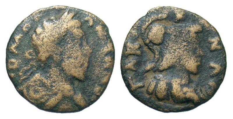 Syria, Decapolis. Canatha. Commodus. A.D. 177-192. Æ 17 (17.2 mm, 2.55 g, 11 h). Scarce. KOMOΔ ANTONOC, laureate, draped and cuirassed bust right / ΓABI KANAΘ, helmeted and draped bust of Athena right. Rosenberger 8; Spijkerman 8; SNG ANS 1267. Fine.