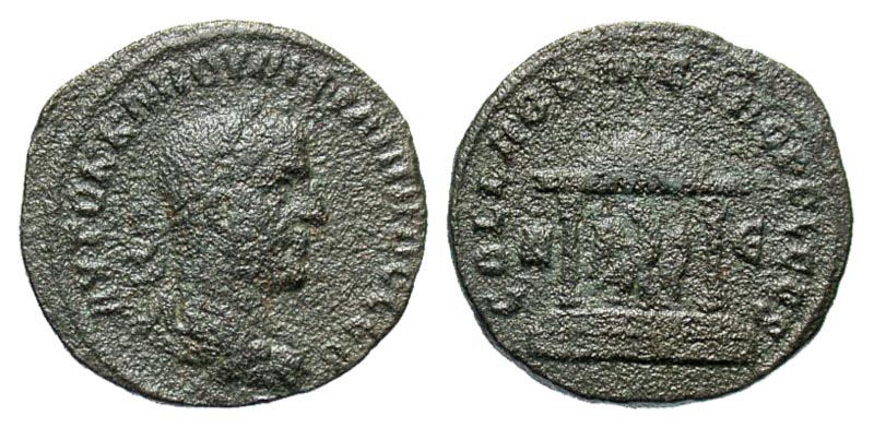 Syria, Seleucis and Pieria. Laodicea ad Mare. Philip I. A.D. 244-249. Æ 26 (25.5 mm, 9.74 g, 1 h). AVTOK K M IOVΛI ΦIΛIΠΠOC CEB, laureate, draped and cuirassed bust right / COL LAOD METROPOLEOS, eagle standing right within domed distyle shrine; Δ-Є on either side. BMC 111; SNG Cop -. aVF, grainy.
