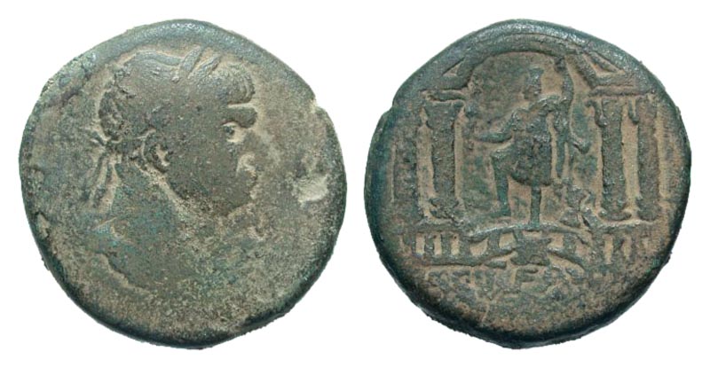 Samaria, Caesarea Maritima. Trajan. A.D. 98-117. Æ 30 (30.0 mm, 23.22 g, 1 h). Scarce. IMP CAES NER TRAIANO OP AVG GER DAC COS VI PP, laureate head right, drapery on left shoulder / C·I·F·AVG, Tetrastyle temple; Tyche standing left within, right foot on prow, holding bust and scepter; half-length figure of river god below. Kadman 22; Rosenberger 19; SNG ANS 761. aFine/aVF.