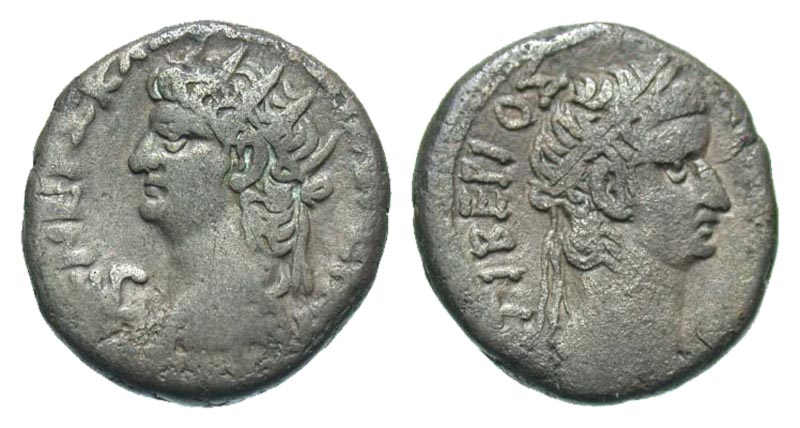 Egypt, Alexandria. Nero. A.D. 54-68. AR tetradrachm (24.0 mm, 12.40 g, 12 h). Year 13 = A.D. 66-67. NEPΩ KΛAVΔAIΣ ΣEB ΓEP AV, LIΓ, radiate head left, wearing aegis / TIBEPIOΣ KAIΣAP, laureate head of Tiberius right. Milne 256; Emmett 134; RPC 5295. aVF.