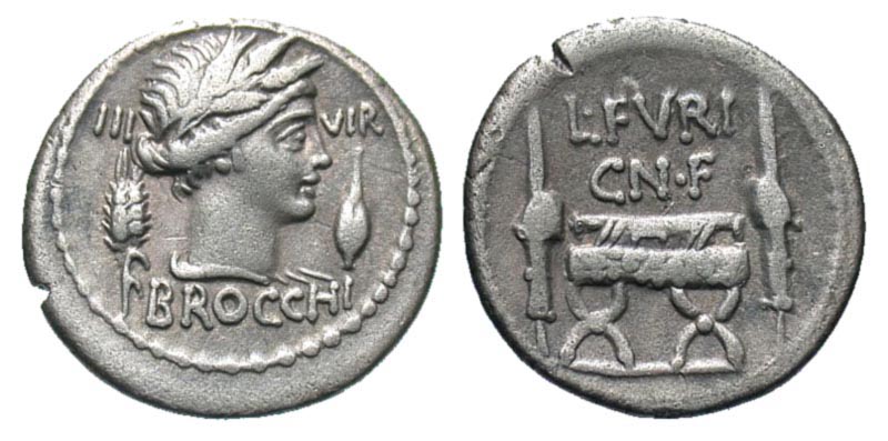 Lot 31-125. L. Furius Cn.f. Brocchus. 63 B.C. AR denarius. Rome mint.
