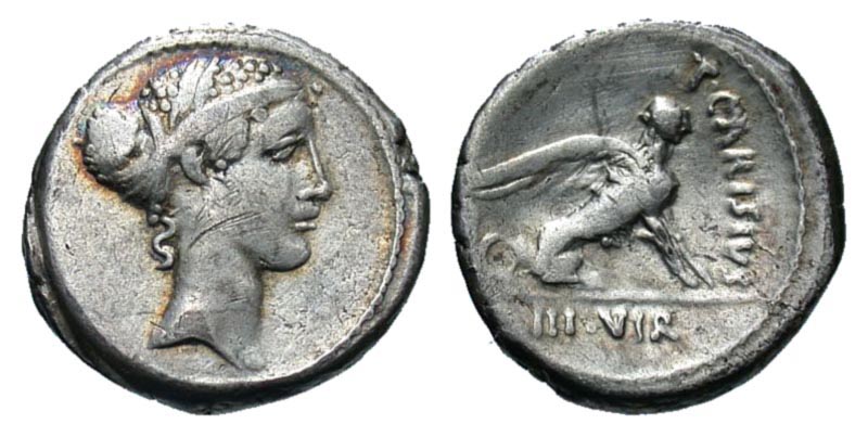 Lot 31-129. T. Carisius. 46 B.C. AR denarius. Rome mint. Scarce.