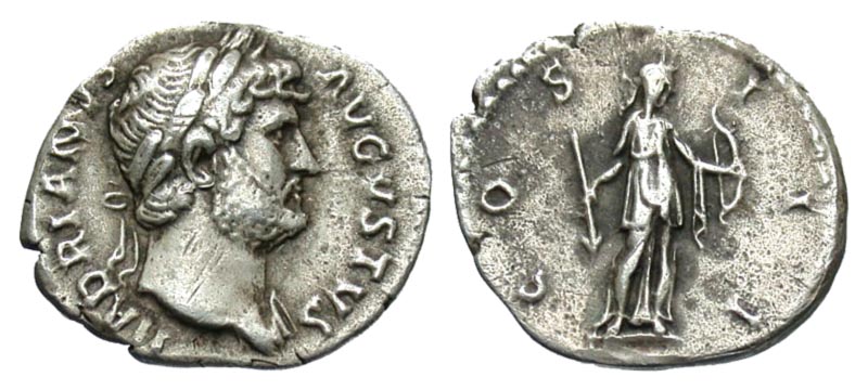 Hadrian. A.D. 117-138. AR denarius (18.6 mm, 2.95 g, 5 h). Rome mint, Struck A.D. 125-128. HADRIANVS AVGVSTVS, laureate head right, slight drapery on left shoulder / COS III, Diana standing right, holding bow and arrow. RIC 147; BMCRE 334; RSC 315a. Toned aVF.