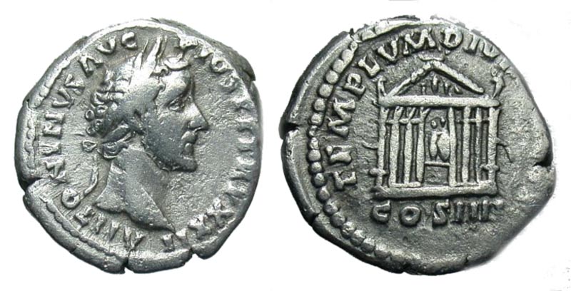 Antoninus Pius. A.D. 138-161. AR denarius (18.2 mm, 3.22 g, 7 h). Rome mint, Struck A.D. 158. ANTONINVS AVG PIVS P P TR P XXII, laureate head right / TEMPL DIVI AVG REST, COS IIII, seated figures of Divus Augustus and Livia, set on podium, within octastyle temple. RIC 290a; BMCRE 939; RSC 804. aVF.